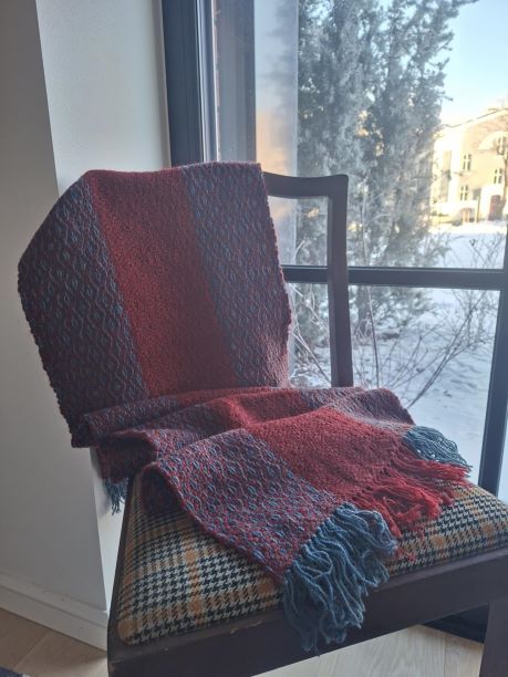Hea soe sall. Mõõdud 0,42 x 1,90 m. Narmad hallikasrohelised ja veinipunased, 100% lambavillased. Koelõng veinipunane alpakavilla sisaldusega väga pehme lõng.