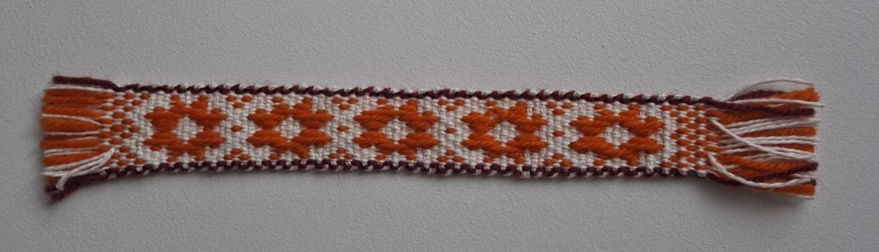 Kirivöö tehnikas käsitsi kootud järjehoidja viie kaheksakannaga oranžis toonis ja madarapunaste äärtega.