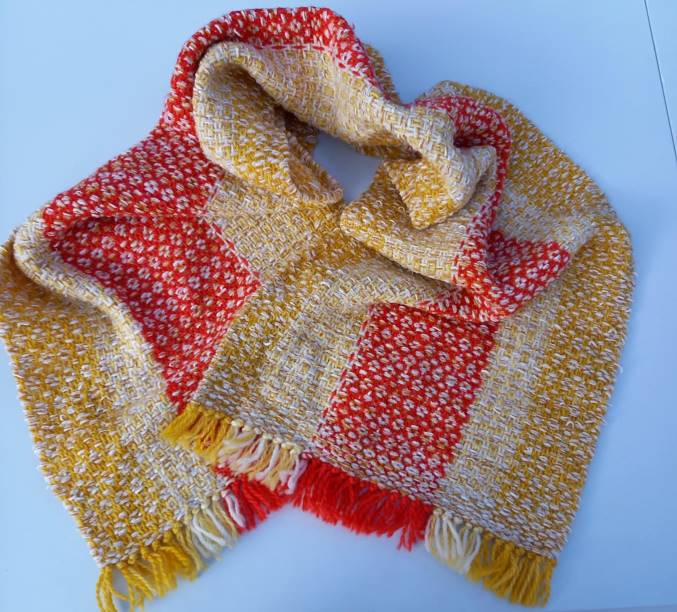 Pehme ja soe sall. Mõõdud 0,41 x 1,85 m. Narmad kollased, valged ja oranžid, 100% lambavillased. Koelõng valge väga pehme dekoratiivlõng.